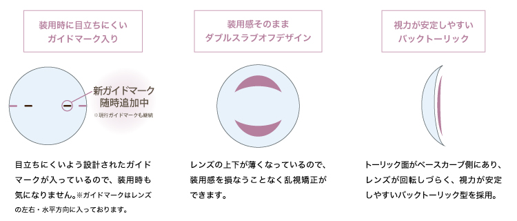 トーリック面がベースカーブ側にあり、レンズが回転しづらく、視力が安定しやすいバックトーリック型を採用。