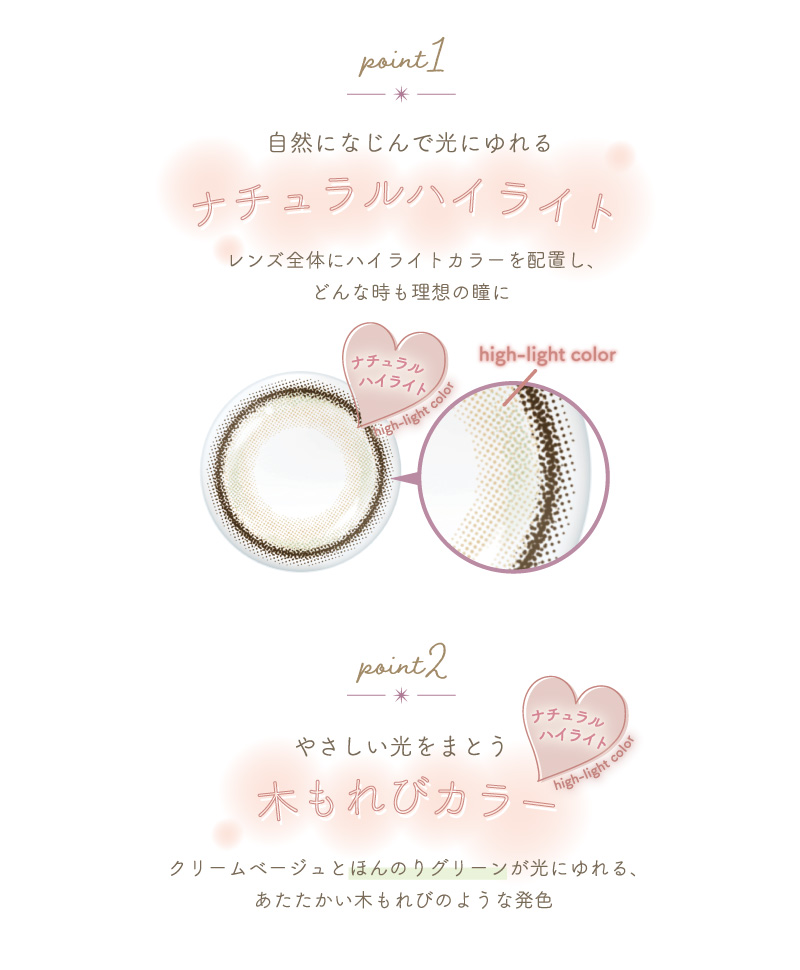 瞳の色に落ち着いたグリーンとオレンジが重なって、人を惹きつける魅力的な目元へ。もともと持つあなたの瞳のキレイな色を、より一層引き立てます。